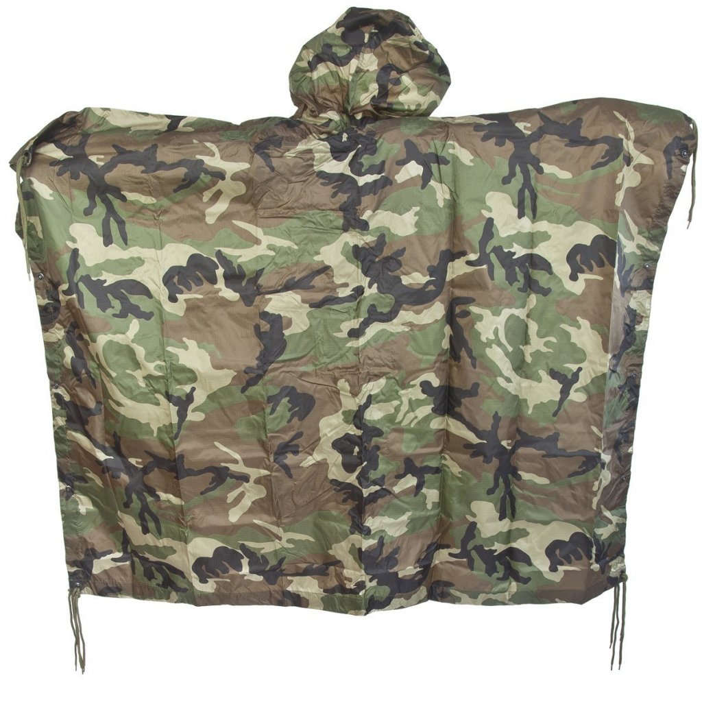 Woodland camouflage ripstop regnponcho i let, super stærk kvalitet. Denne gode, enkle letvægts regn-poncho har ekstra forstærkninger i stoffet, solide metalknapper i siden samt god hætte med snøring, så den kan strammes til ved ansigtet. Inde i ponchoen sidder der en snøre, så regnslaget kan strammes fast til livet, hvis der er stærk blæst eller du cykler. Hvis du er på vildmarks-tur kan ponchoen også knappes op og bruges som bivuak, og den har snørehuller i kanten til samme formål. Regn-slaget fylder ikke meget i tasken, da det i sammenrullet tilstand ikke fylder meget mere end et stort kaffekrus. Butikkens absolutte bestseller i det våde, danske vejr! Materiale: PVC stof i ekstra god ripstop-forstærket kvalitet