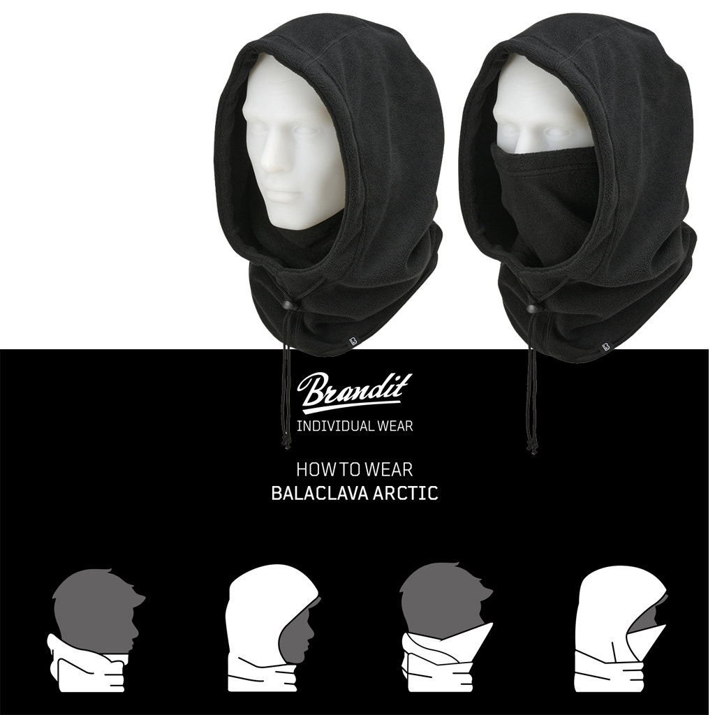 Brandit Arctic Balaclava - En multifunktionel balaclava lavet af varmt og let at pleje fleece. Den er hudvenlig og hurtigtørrende, med en hætte med snor og stopper samt en længere pasform, der beskytter nakken og halsen. Hold dig varm og komfortabel i kulden med denne alsidige balaclava