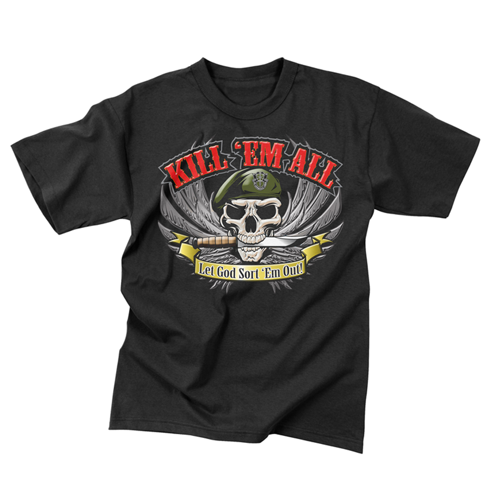USA's militær T-shirt sort med "Kill Em All". Lavet af 50% bomuld & 50% polyester. Høj kvalitet t-shirt til en fantastisk pris. Fås i Small - XXL.