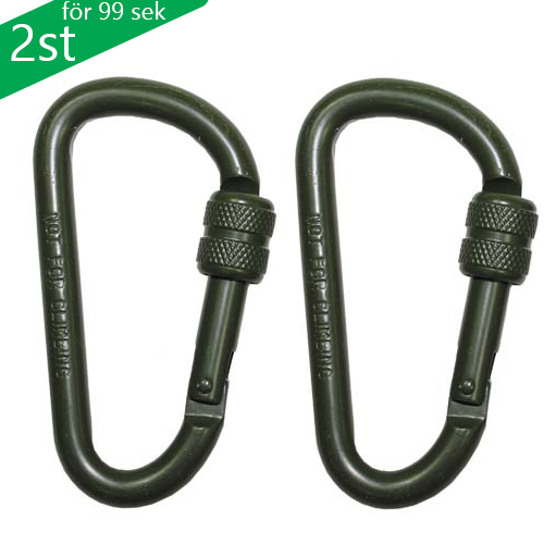 Militär karbinhake som är tillverkad i kraftig aluminium ett lätt och starkt material. Karbinhaken har en brottstyrka på 90kg och är särskilt lämpad för att fästa utrustning på västar eller ryggsäckar. Även om de är starka, är de inte lämpliga för klättring eller livräddning. Lite kraftigare karbinhakar med skruvlås för säker fastsättning av din utrustning på ryggan eller i byxhällan.