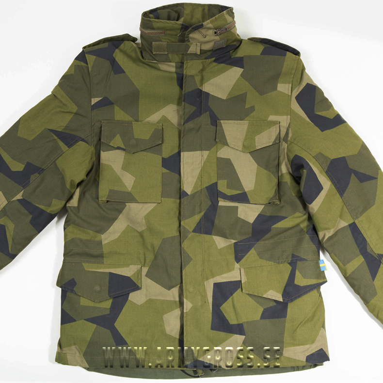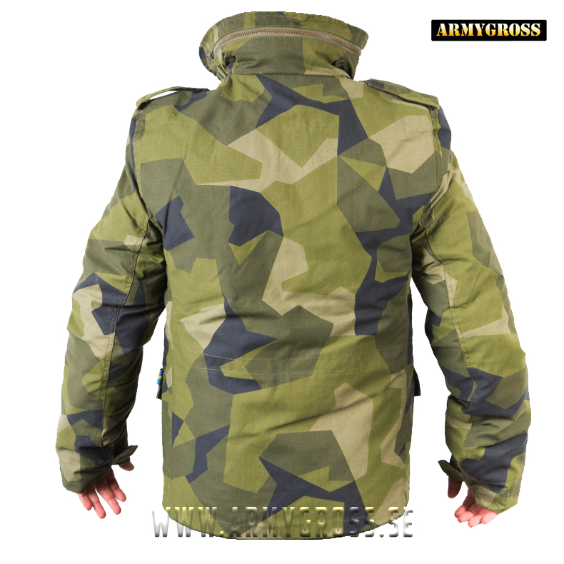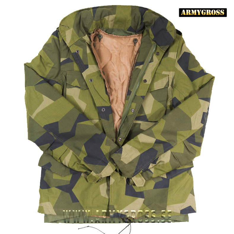 Army inspirerad M65 jacka med värmefoder i M90 Camo, tillverkad av 50% bomull och 50% polyester i varpsatin, samma tyg som används i dagens M90 uniformer. Det här är i det stora hela en vanlig M65 jacka fast med lite dyrare material som håller flera år. Denna M65 klassiker har en dragsko i midjan för en tajtare passform när det är blåsigt. Jackan har två bröstfickor och två sidfickor, axelklaffar och dragkedja i kragen.