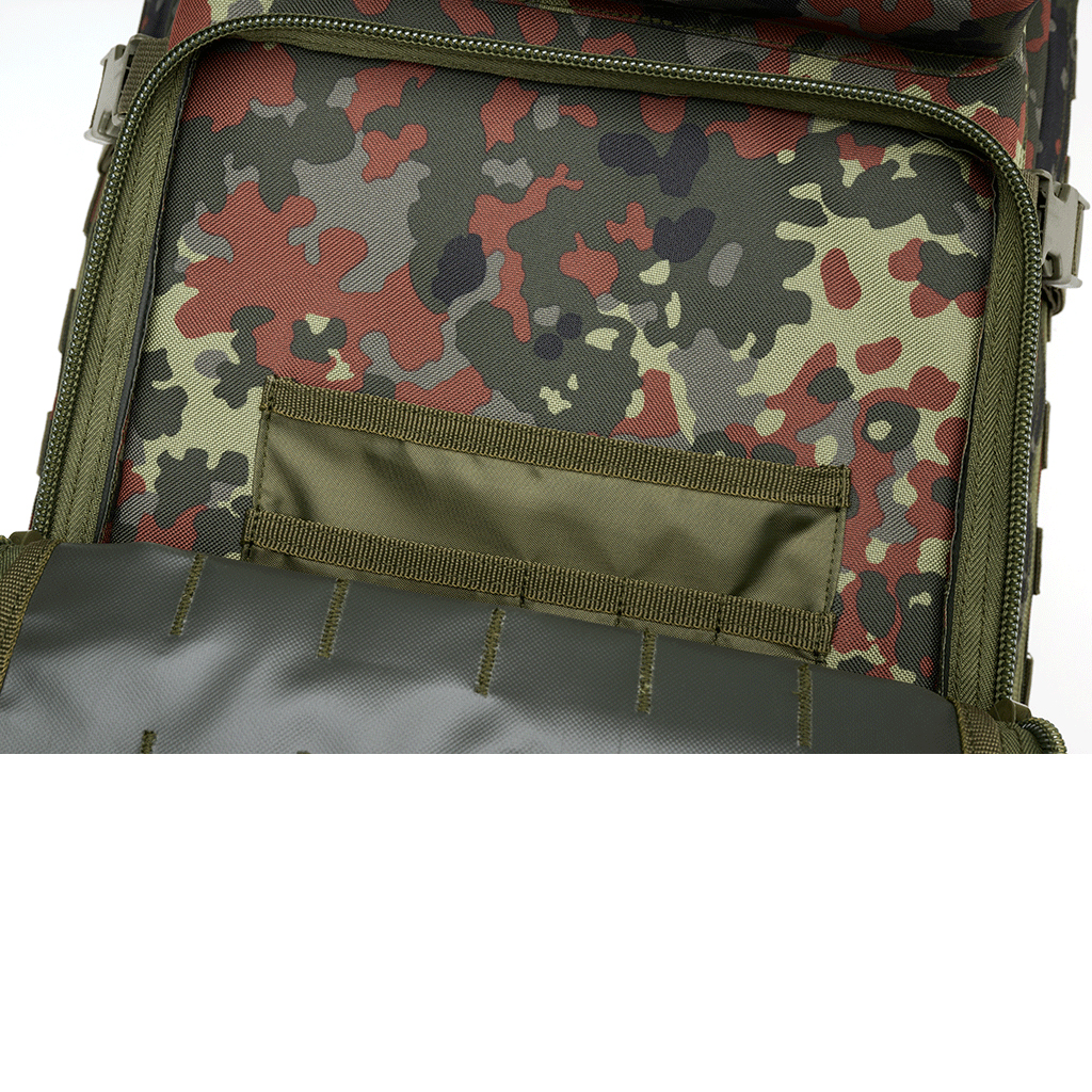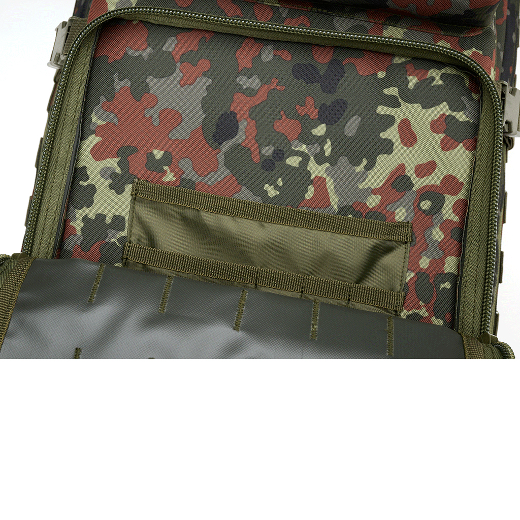 Tämä reppu on varustettu MOLLE-järjestelmällä, jonka avulla voit mukauttaa ja laajentaa sitä omien tarpeidesi mukaan. Lisävarusteet ja ylimääräinen varustus on helppo kiinnittää, jotta olet valmis kaikkiin seikkailuihin.
