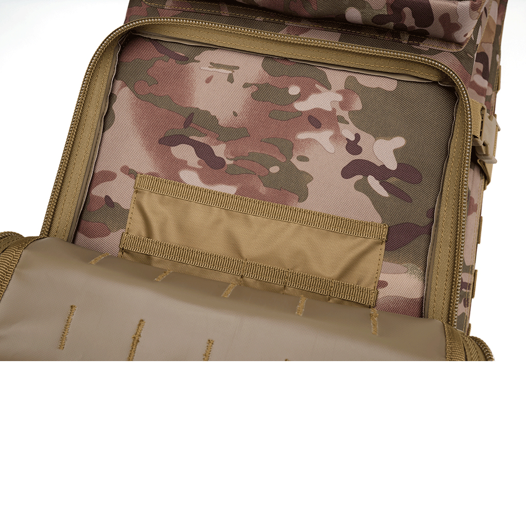 Tämä reppu on varustettu MOLLE-järjestelmällä, jonka avulla voit mukauttaa ja laajentaa sitä omien tarpeidesi mukaan. Lisävarusteet ja ylimääräinen varustus on helppo kiinnittää, jotta olet valmis kaikkiin seikkailuihin.